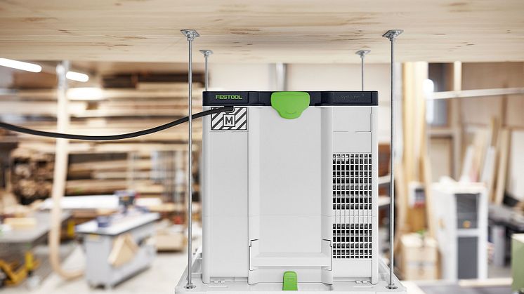 Festool har designet sin nye luftrenser i det praktiske, kompakte Systainer³-format. Fordi den vejer så lidt, kan den bruges både mobil og stationær. Den nye SYS-AIR er desuden nem at bruge og kan reguleres i to trin. En advarselslampe fortæller dig, hvornår det er tid til at skifte filter. Er pladsen begrænset på værkstedet, er den praktiske loftholder en sikker og enkel løsning. Og det er ekstra praktisk, at du kan skifte filteret der meget hurtigt og bekvemt uden at skulle tage SYS-AIR ned. Takket være T-LOC kan SYS-AIR låses i loftholderen og lynhurtigt tages ned, hvis den i stedet skal bruges mobilt. Det giver fuld fleksibilitet både på værkstedet og på byggepladsen. Festool har også tænkt sig lidt ekstra, når det kommer til at bruge luftrenseren mobilt: Den kan integreres i en støvvæg - og det er muligt at seriekoble flere SYS-AIR luftrensere i store rum.