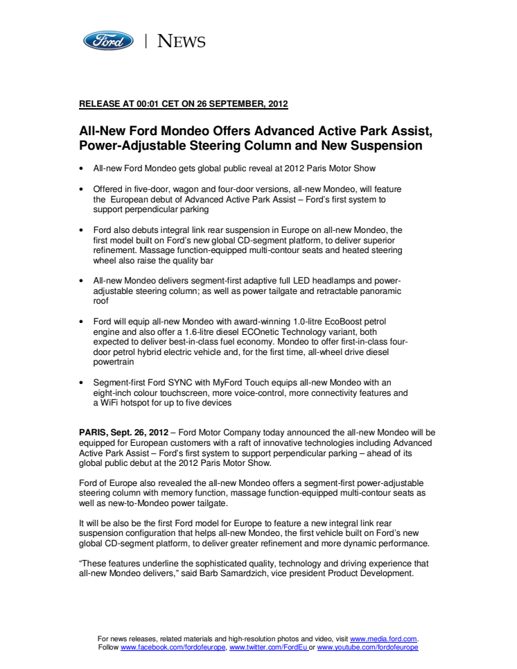 All-New Ford Mondeo Offers Advanced Active Park Assist, Power-Adjustable Steering Column and New Suspension