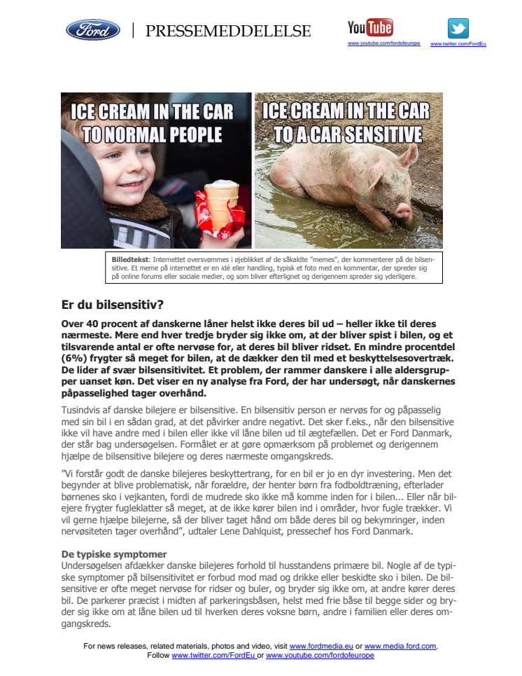 Over 40 procent af danskerne låner helst ikke deres bil ud – heller ikke til deres nærmeste. Mere end hver tredje bryder sig ikke om, at der bliver spist i bilen, og et tilsvarende antal er ofte nervøse for, at deres bil bliver ridset. En mindre pro-centdel (6%) frygter så meget for bilen, at de dækker den til med et beskyttelses-overtræk. De lider af svær bilsensitivitet.