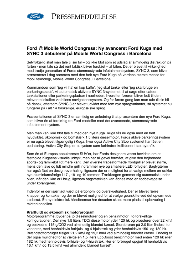 Selvfølgelig skal man tale til sin bil – og ikke blot som et udslag af almindelig distraktion på farten - men tale så det rent faktisk bliver forstået – af bilen. Det er virkelighed med tredje generation af Fords stemmestyrede infotainmentsystem, SYNC 3, som bliver præsenteret i dag sammen med den helt nye Ford Kuga på verdens største messe for mobil teknologi, Mobile World Congress, i Barcelona.