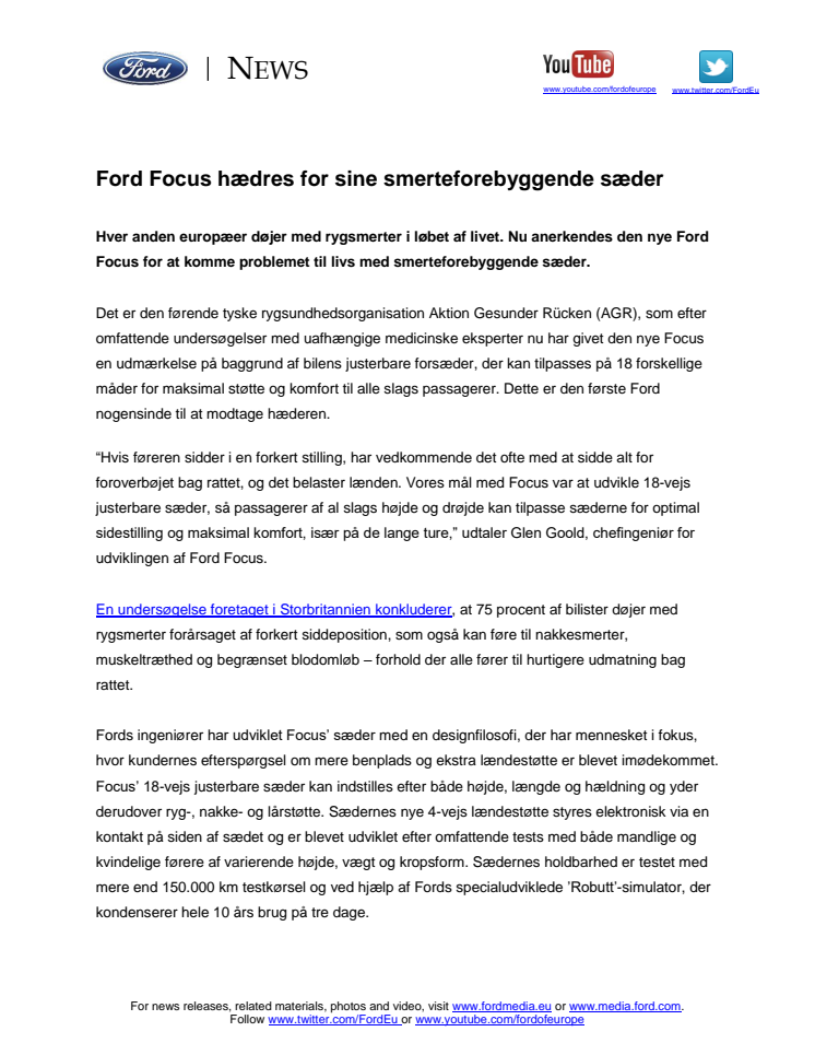Hver anden europæer døjer med rygsmerter i løbet af livet. Nu anerkendes den nye Ford Focus for at komme problemet til livs med smerteforebyggende sæder.