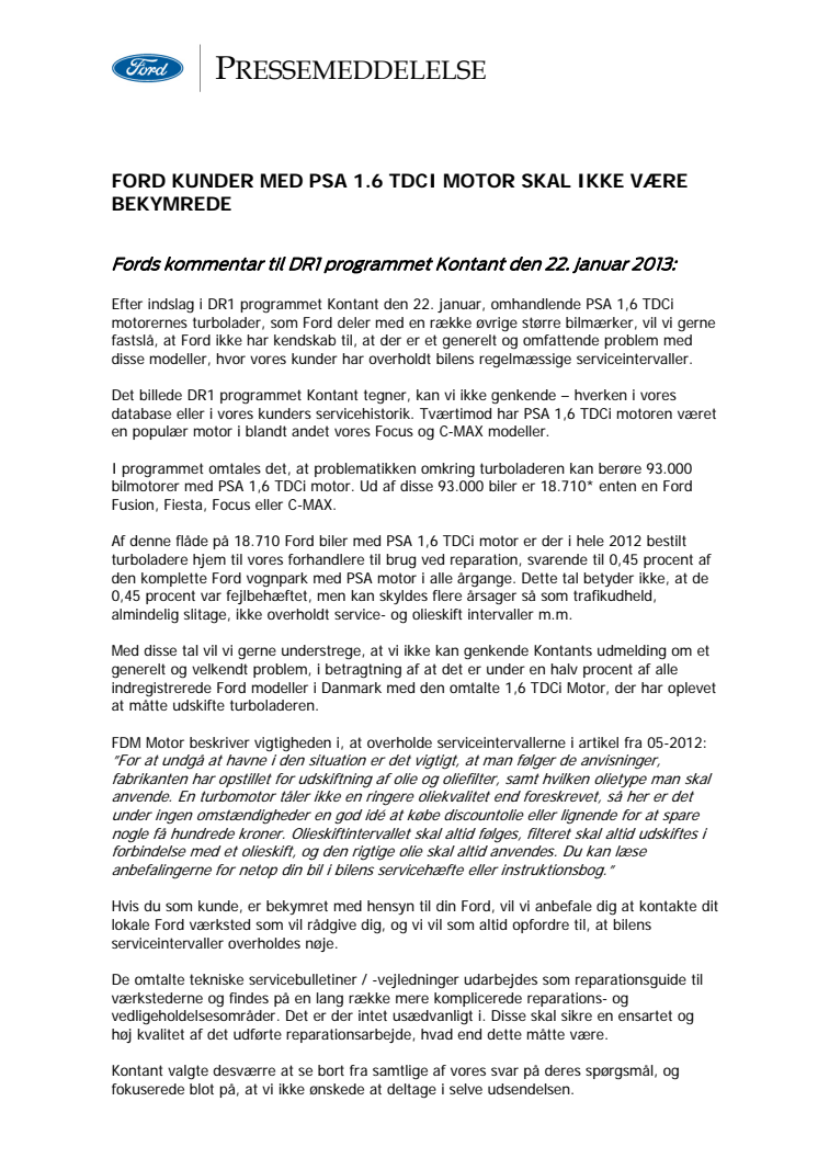 Efter indslag i DR1 programmet Kontant, omhandlende PSA 1,6 TDCi motorernes turbolader, som Ford deler med en række øvrige større bilmærker, vil vi gerne fastslå, at Ford ikke har kendskab til, at der er et generelt og omfattende problem med disse modeller.