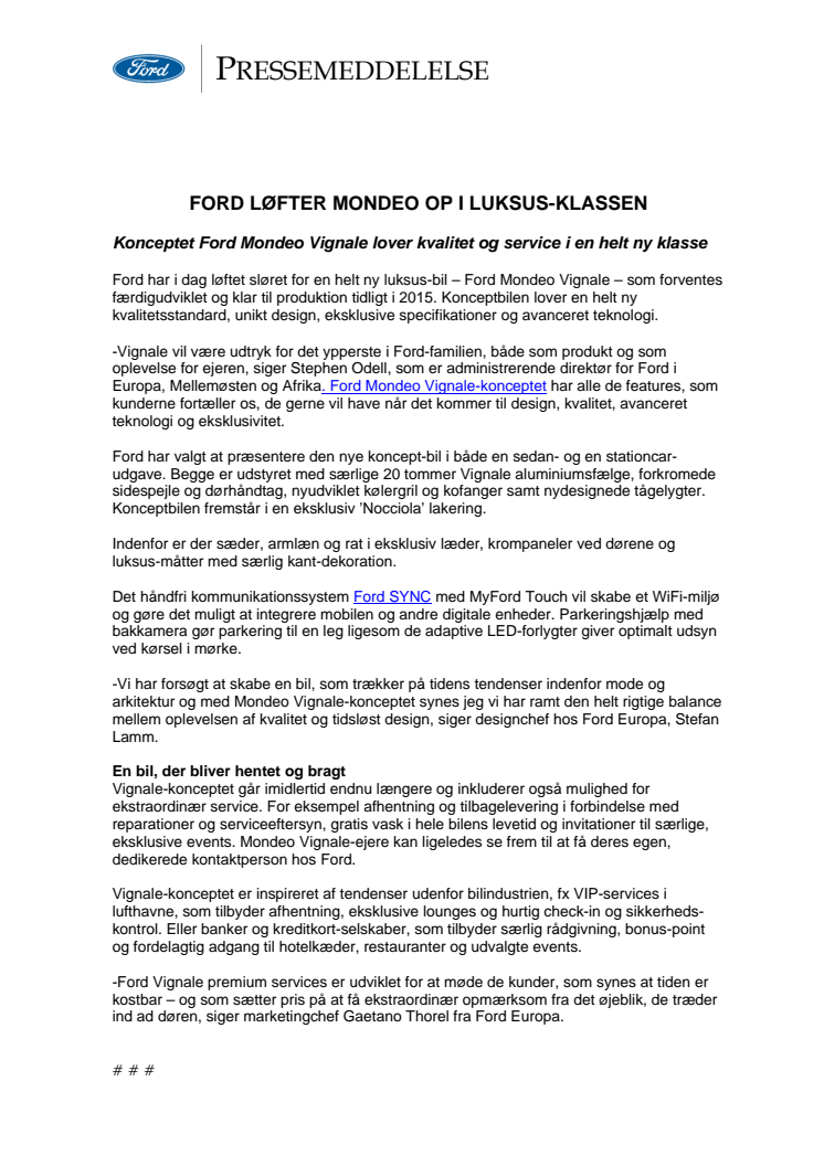 Ford har i dag løftet sløret for en helt ny luksus-bil – Ford Mondeo Vignale – som forventes færdigudviklet og klar til produktion tidligt i 2015. Konceptbilen lover en helt ny kvalitetsstandard, unikt design, eksklusive specifikationer og avanceret teknologi.