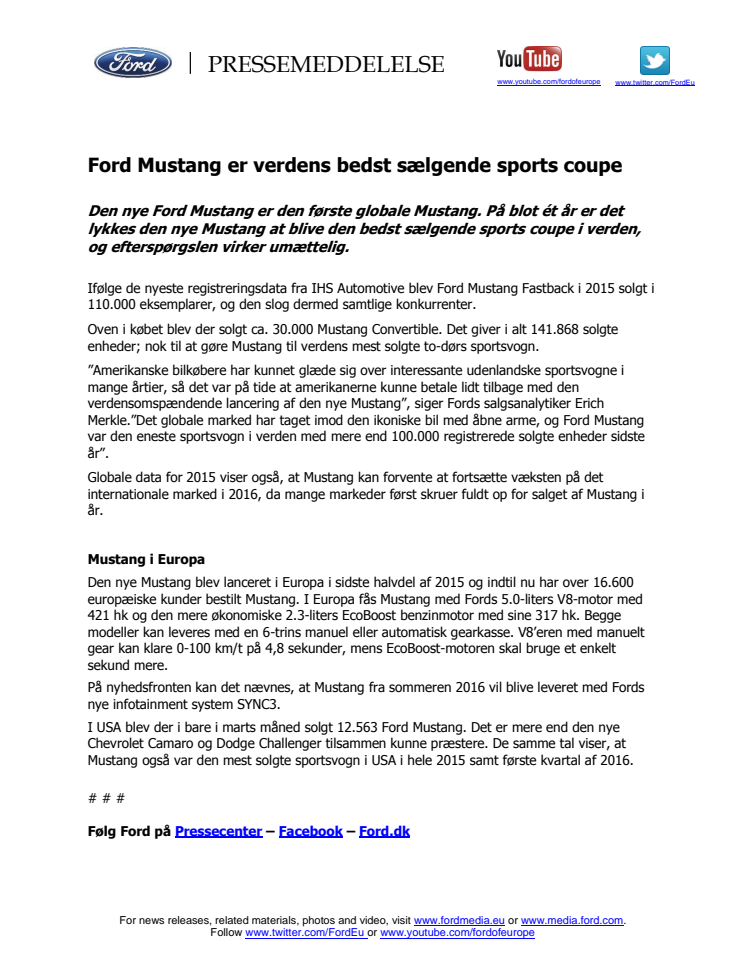 Den nye Ford Mustang er den første globale Mustang. På blot ét år er det lykkes den nye Mustang at blive den bedst sælgende sports coupe i verden, og efterspørgslen virker umættelig.