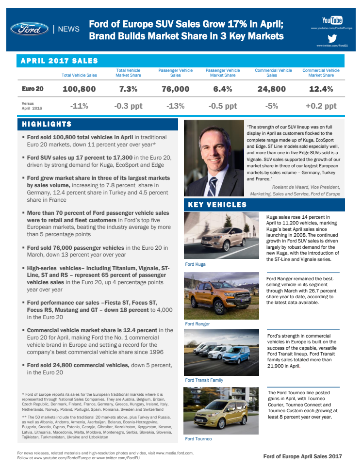 “The strength of our SUV lineup was on full display in April as customers flocked to the complete range of Kuga, EcoSport and Edge. SUV sales supported the growth of our market share in three of our largest European markets by sales volume – Germany, Turkey and France.” said Roelant de Waard, Vice President, Marketing, Sales and Service, Ford of Europe