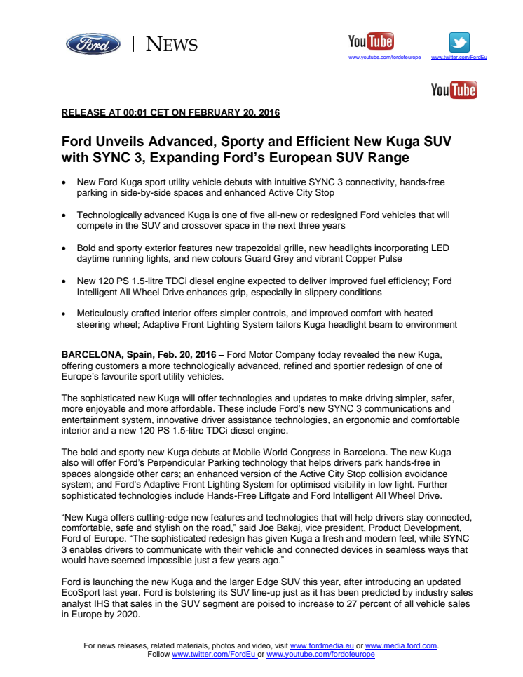 Læs meget mere om den nye Kuga i det vedhæftede dokument indeholdende den europæiske pressemeddelelse.