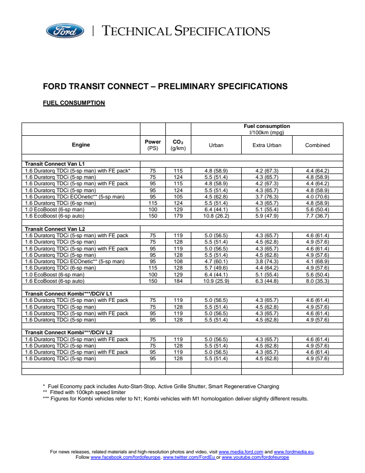 FORD TRANSIT CONNECT - TEKNISKE SPECIFIKATIONER