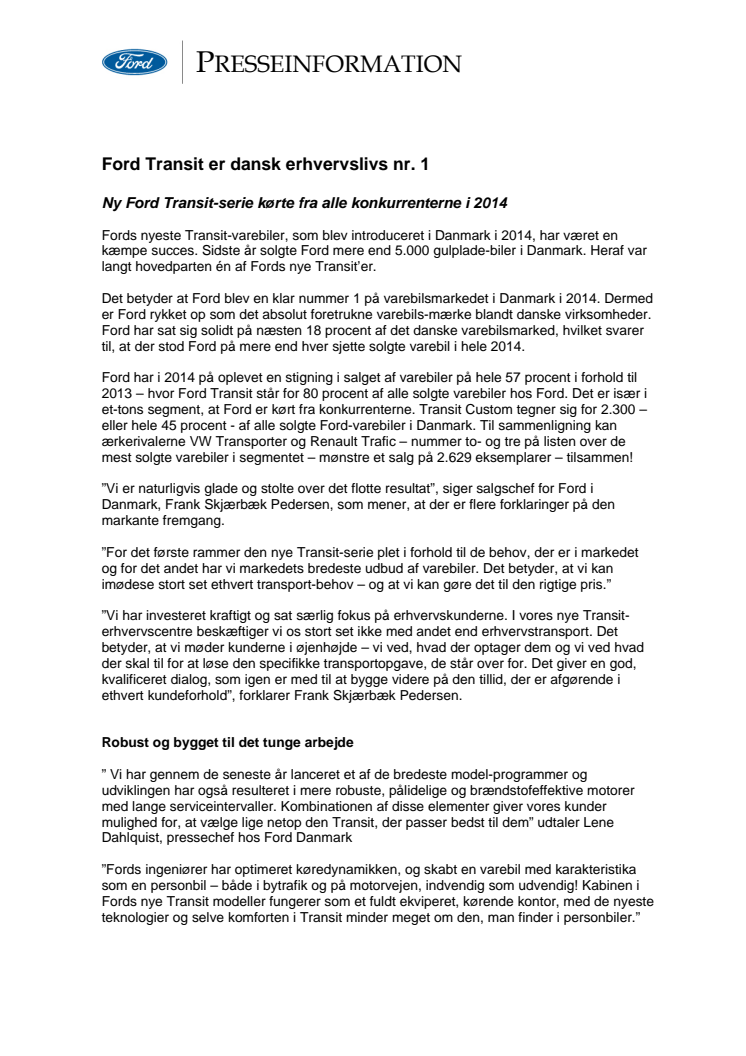 Fords nyeste Transit-varebiler, som blev introduceret i Danmark i 2014, har været en kæmpe succes. Sidste år solgte Ford mere end 5.000 gulplade-biler i Danmark. Heraf var langt hovedparten én af Fords nye Transit’er.