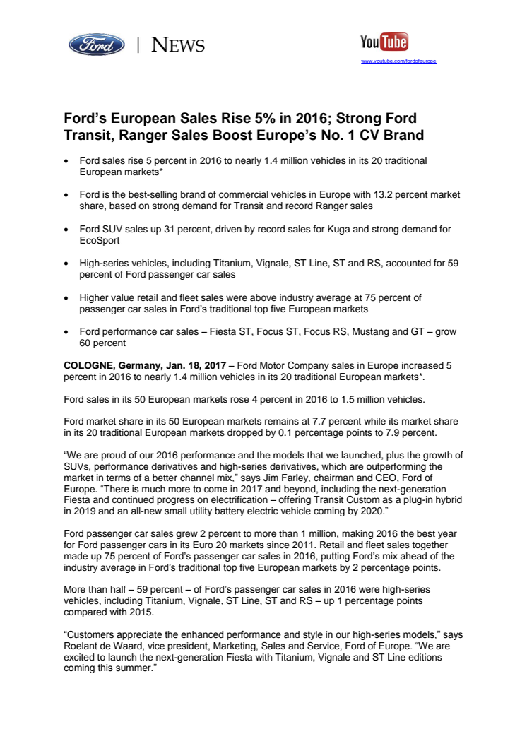 Fords salg er steget med 5% i 2016. Den ledende plads i salget af varebiler, med en markedsandel på 13,2%, beholdes stadig. Læs den fulde rapport på engelsk her.