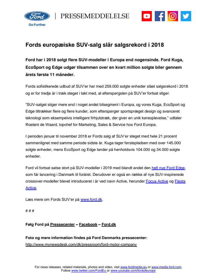 Ford har i 2018 solgt flere SUV-modeller i Europa end nogensinde. Ford Kuga, EcoSport og Edge udgør tilsammen over en kvart million solgte biler gennem årets første 11 måneder.
