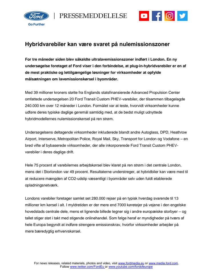 For tre måneder siden blev såkaldte ultralavemissionszoner indført i London. En ny undersøgelse foretaget af Ford viser i den forbindelse, at plug-in-hybridvarebiler er en af de mest praktiske og lettilgængelige løsninger for virksomheder at opfylde målsætningen om lavemissionskørsel i byområder.