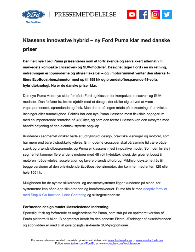 Den helt nye Ford Puma præsenteres som et forfriskende og selvsikkert alternativ til markedets kompakte crossover- og SUV-modeller. Designet tager Ford i en ny retning, indretningen er topmoderne og uhyre fleksibel – og i motorrummet venter den stærke 1-liters EcoBoost-benzinmotor med op til 155 hk og brændstofbesparende 48-volts hybridteknologi. Nu er de danske priser klar.