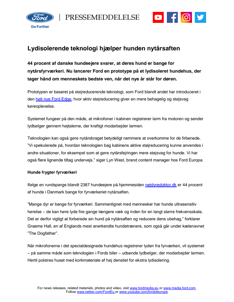 44 procent af danske hundeejere svarer, at deres hund er bange for nytårsfyrværkeri. Nu lancerer Ford en prototype på et lydisoleret hundehus, der tager hånd om menneskets bedste ven, når det nye år står for døren.