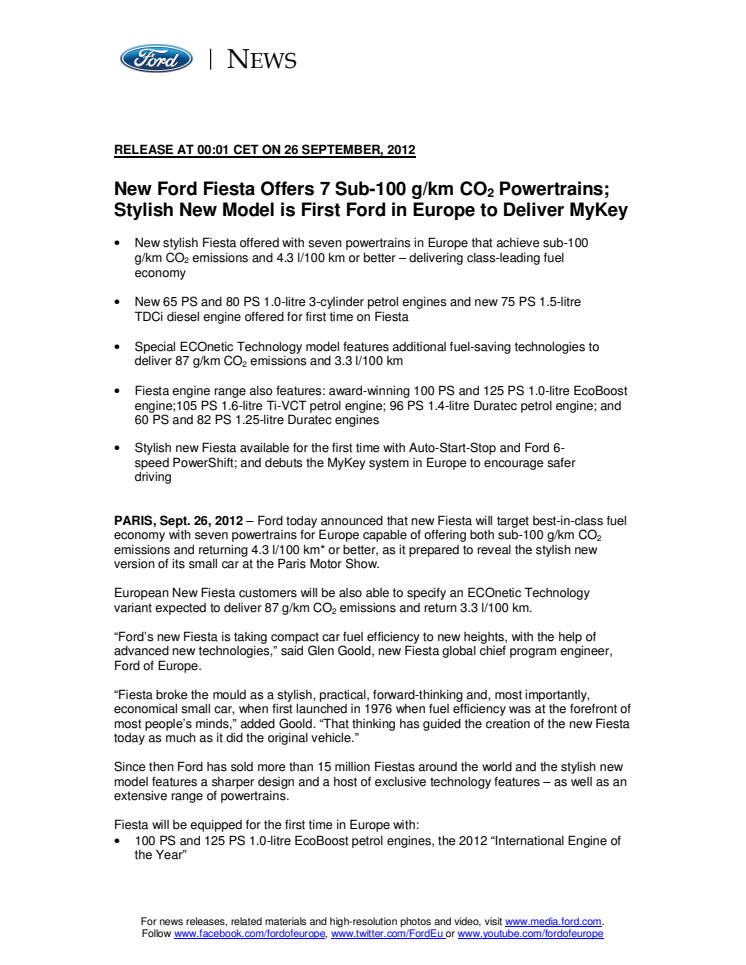 New Ford Fiesta Offers 7 Sub-100 g/km CO2 Powertrains; Stylish New Model is First Ford in Europe to Deliver MyKey
