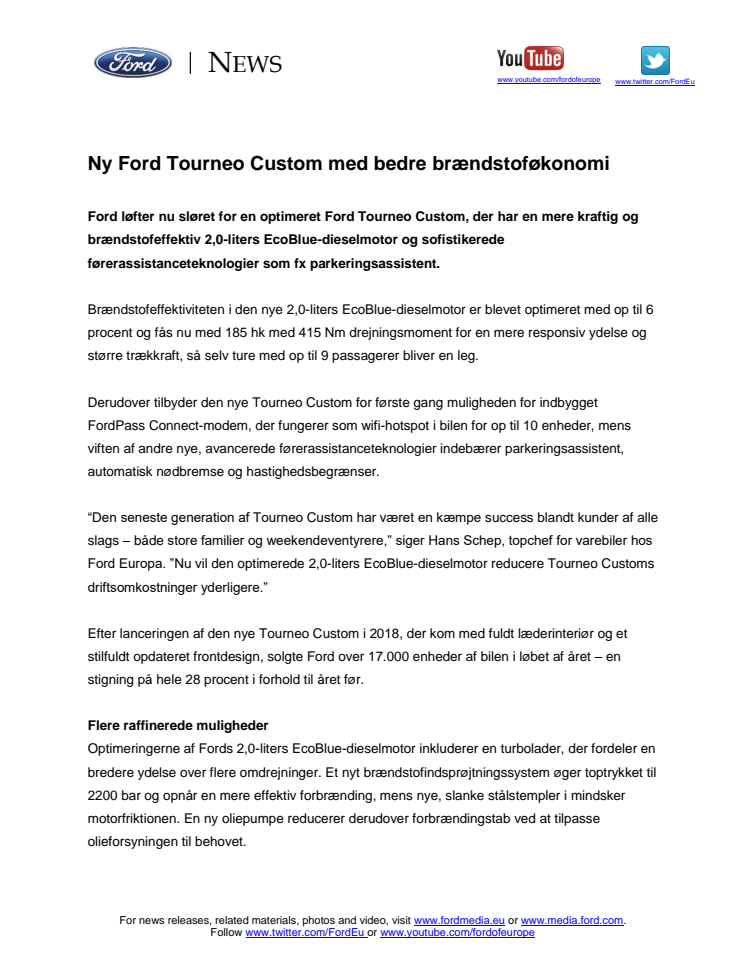 Ford løfter nu sløret for en optimeret Ford Tourneo Custom, der har en mere kraftig og brændstofeffektiv 2,0-liters EcoBlue-dieselmotor og sofistikerede førerassistanceteknologier som fx parkeringsassistent.