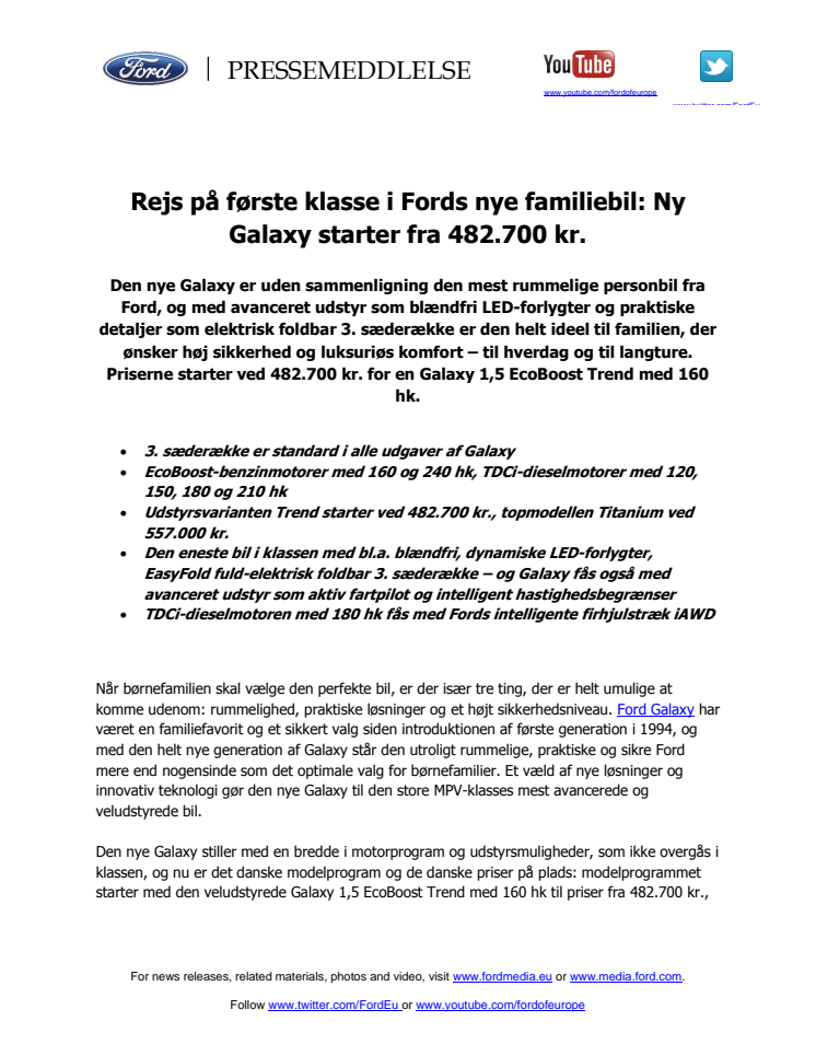 Den nye Galaxy er uden sammenligning den mest rummelige personbil fra Ford, og med avanceret udstyr som blændfri LED-forlygter og praktiske detaljer som elektrisk foldbar 3. sæderække er den helt ideel til familien, der ønsker høj sikkerhed og luksuriøs komfort – til hverdag og til langture. Priserne starter ved 482.700 kr. for en Galaxy 1,5 EcoBoost Trend med 160 hk.