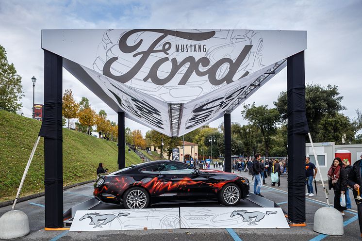 En Ford Mustang med uoprettelig skade indvendigt genopstår som graffitikunstværk.