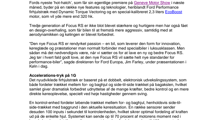 ”Den nye Focus RS er rendyrket passion – en bil, som leverer den form for innovation, køreglæde og præstationer man normalt forbinder med specialbiler i luksusklassen. Men sådan må det nødvendigvis være, når vi sætter os for at lave en ny og bedre Focus RS. Jeg tør i hvert fald godt love, at den nye Focus RS vil sætte helt nye standarder for performance-biler”, sagde direktøren for Ford Europa, Jim Farley, under præsentationen i Køln i dag.