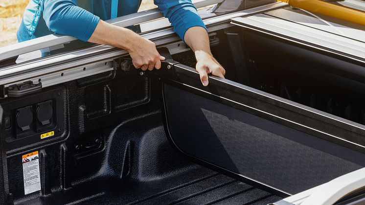 - Et elektrisk ladrulledækken er også tilgængeligt. Det kan rulles op og i med brug af en nøgle, inde fra kabinen i instrumentbrættet eller ved at anvende en knap placeret i ladet. Det stopper helt automatisk i tilfælde af modstand, hvis der for eksempel sidder et stykke træ eller anden last i klemme. Langs siderne af det elektriske rulleladdækken er der desuden monteret greb, der kan anvendes til at fastgøre for eksempel cykler, ski, kajakker, campingudstyr eller lignende.