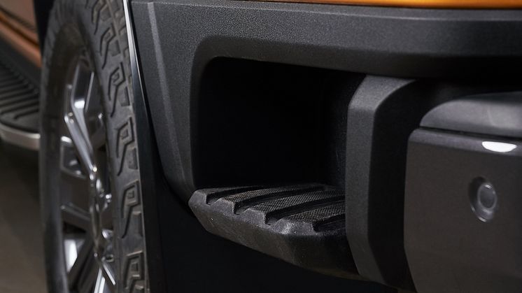 - Det nye integrerede trin bag bagdækkene har skabt en stabil og optimal måde at klatre op i ladet. Trinnet er fastgjort direkte i forlængelse af ladet, så kunderne nu slipper for at kravle op via bilens bagdæk for at få adgang til ladet uden at åbne bagklappen.