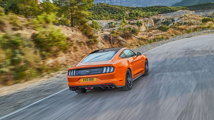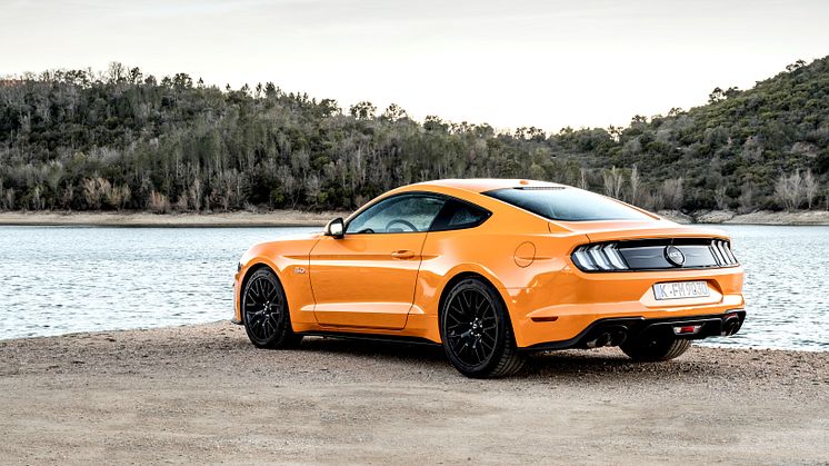Ford Mustang fås i Europa som fastback og convertible med 450 hk. Begge varianter kommer med Fords kraftfulde 5,0-liters V8-benzinmotor og tilbydes med 6-trins manuelt gear eller 10-trins automatgear.