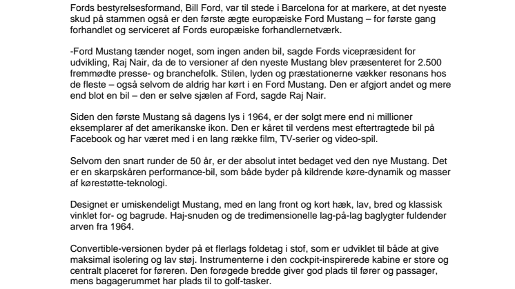 Fords bestyrelsesformand, Bill Ford, var til stede i Barcelona for at markere, at det nyeste skud på stammen også er den første ægte europæiske Ford Mustang – for første gang forhandlet og serviceret af Fords europæiske forhandlernetværk.
