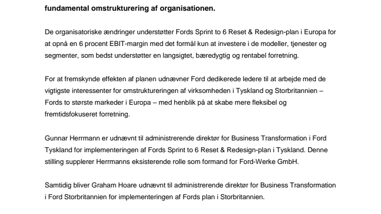 De organisatoriske ændringer understøtter Fords Sprint to 6 Reset & Redesign-plan i Europa for at opnå en 6 procent EBIT-margin med det formål kun at investere i de modeller, tjenester og segmenter, som bedst understøtter en langsigtet, bæredygtig og rentabel forretning.