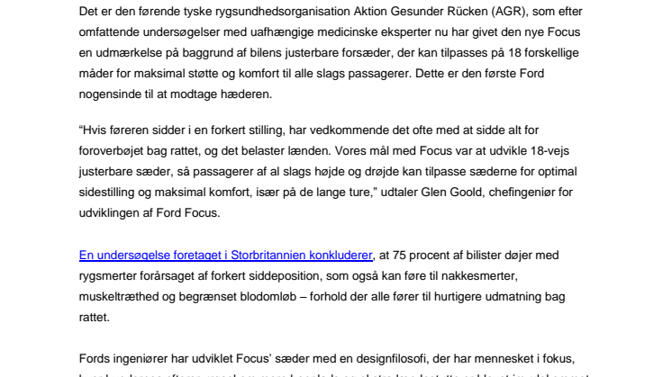Det er den førende tyske rygsundhedsorganisation Aktion Gesunder Rücken (AGR), som efter omfattende undersøgelser med uafhængige medicinske eksperter nu har givet den nye Focus en udmærkelse på baggrund af bilens justerbare forsæder, der kan tilpasses på 18 forskellige måder for maksimal støtte og komfort til alle slags passagerer. Dette er den første Ford nogensinde til at modtage hæderen.
