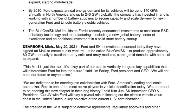Ford indgår joint venture med den globale batteriproducent SK Innovation, som en vigtig del af Fords succesfulde elektrificeringsstrategi