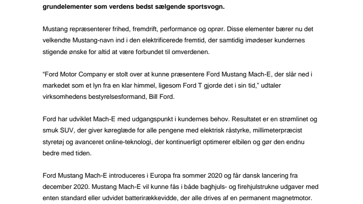 “Ford Motor Company er stolt over at kunne præsentere Ford Mustang Mach-E, der slår ned i markedet som et lyn fra en klar himmel, ligesom Ford T gjorde det i sin tid,” udtaler virksomhedens bestyrelsesformand, Bill Ford.