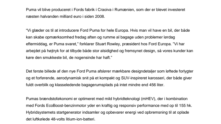 “Vi glæder os til at introducere Ford Puma for hele Europa. Hvis man vil have en bil, der både kan skabe opmærksomhed fredag aften og rumme al bagage uden problemer lørdag eftermiddag, er Puma svaret,” forklarer Stuart Rowley, præsident hos Ford Europa. ”Vi har arbejdet på højtryk for at tilbyde både stor alsidighed og fremsynet design, så vores kunder kan køre den smukkeste bil, de nogensinde har haft.”