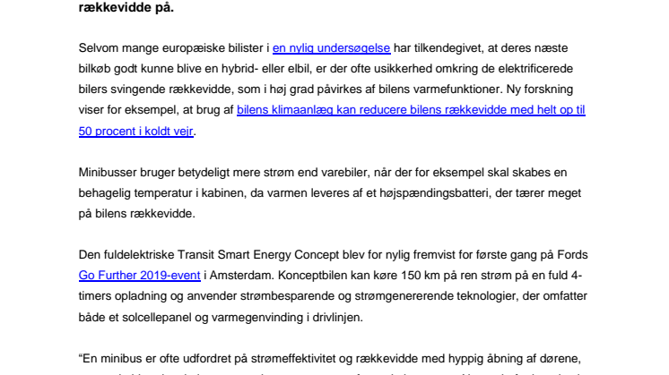 “En minibus er ofte udfordret på strømeffektivitet og rækkevidde med hyppig åbning af dørene, en stor kabine der skal temperaturjusteres og en omfattende lasteevne. Netop derfor har vi valgt en ombygget Transit-minibus til vores Smart Energy Concept,” forklarer Kilian Vas, projektleder for bilarkitektur hos Ford Europa. ”Gennem dette koncept har vi fundet en række smarte måder at spare strøm på, der fremover vil kunne optimere køreoplevelsen i elektrificerede biler.”