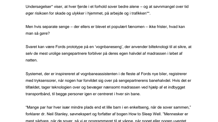 Det er altid en lettelse at putte i sengen med sin bedre halvdel efter en hektisk dag. Men for dem, der deler seng, kan dyrebare timers nattesøvn gå tabt i kamp om madrassen. Nu lancerer Ford en prototype på en seng, der tager hånd om problemet med bilteknologi.
