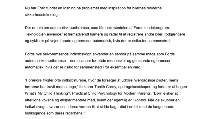 “Automatisk nødbremse gør vores biler meget mere sikre, da man som bilist enten undgår et sammenstød helt eller mindskerne skaderne betydeligt, hvis uheldet er ude. At anvende teknologien i noget så hverdagsligt som en indkøbsvogn er en god måde at gøre det avancerede sikkerhedssystem mere letforståeligt,” siger Anthony Ireson, topchef for marketing hos Ford Europa.