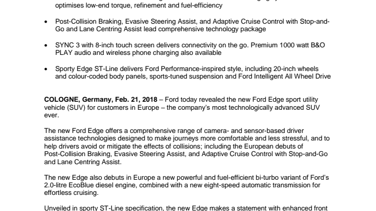 ”SUV’er bliver mere og mere populære hos vores europæiske kunder, og vores udvalg rammer plet lige nu. Med ny teknologi, som hjælper bilisterne i trafikken, og samtidig sikrer en mere behagelig køreoplevelse, er den nye Edge vores mest overbevisende SUV til dato”, siger Roelant de Waard, Vice President, Marketing, Sales & Service, Ford Europe.