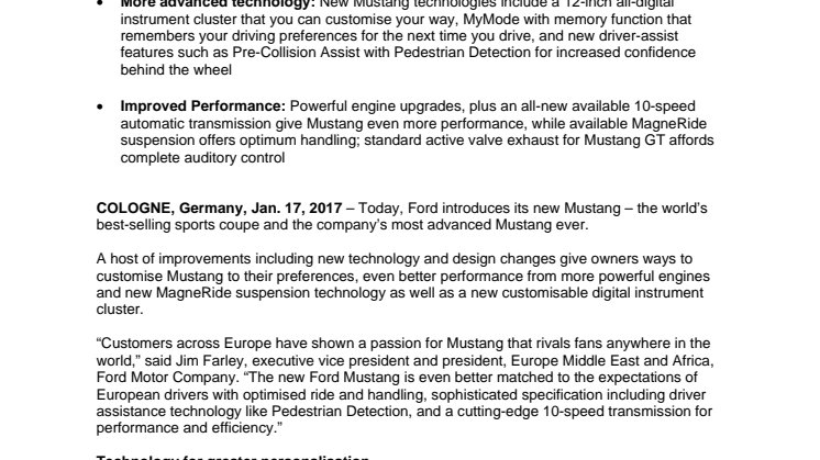 ”Kunder rundt i Europa har vist en passion for Mustang, der tænder gnisten for fans overalt i verden,” fortæller Jim Farley, Executive Vice President og President for Ford Motor Company i Europa, Mellemøsten og Afrika. ”Den nye Mustang passer endnu bedre til de forventninger europæiske kunder har, med optimerede køreegenskaber, sofistikerede løsninger der inkluderer førerasssistanceteknologier som Pedestrian Detection – og en banebrydende 10-trins automatisk gearkasse giver endnu bedre ydeevne og effektivitet.”