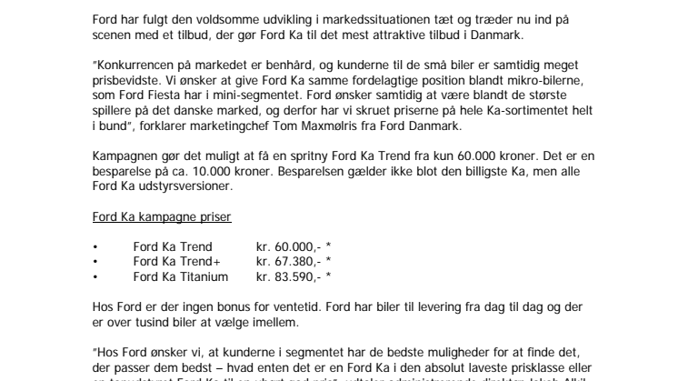 ”Konkurrencen på markedet er benhård, og kunderne til de små biler er samtidig meget prisbevidste. Vi ønsker at give Ford Ka samme fordelagtige position blandt mikro-bilerne, som Ford Fiesta har i mini-segmentet. Ford ønsker samtidig at være blandt de største spillere på det danske marked, og derfor har vi skruet priserne på hele Ka-sortimentet helt i bund”, forklarer marketingchef Tom Maxmølris fra Ford Danmark.
