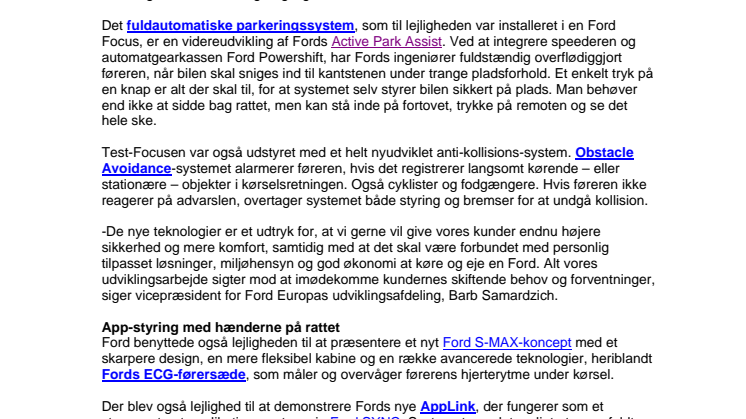 En bil, der parkerer helt af sig selv ved et enkelt tryk på en knap. Eller en bil, der, helt automatisk, bremser og styrer uden om kollisioner bliver virkelighed inden for nogle få år. I denne uge løftede Ford sløret for en række af fremtidens smarte bil-teknologier. Det skete under arrangementet Ford Futures på Fords europæiske center for research og avanceret udvikling i Lommel i Belgien. Et hold af eksperter præsenterede prototyper af de teknologier, som bliver tilgængelige i fremtidens Ford-modeller.