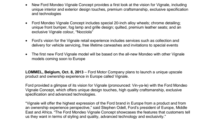 ”FordStores er den perfekte platform for at lancere vores Ford Vignale-oplevelse. Vignale er designet til krævende kunder, for hvem tiden og kvalitetsoplevelser er i centrum. Vignale sikrer personlig service, som er skræddersyet til den enkelte kundes behov, og man vil føle sig som noget særligt fra det øjeblik, man træder ind i Vignale Lounge i sin FordStore,” fortæller Gaetano Thorel, Ford Europas vicepræsident for marketing, og fortsætter: ”Kunderne i dag forlanger mere fra deres bilmærke end bare produktet. De vil have personlig betjening og service, som lever op til de behov og krav, de har. Ford Vignale giver os en vigtig mulighed for at udvide og styrke vores appeal overfor denne kundetype, og man vil opleve premiumprodukter med afbalancerede køreegenskaber og kvalitet og håndværk på et nyt niveau.”