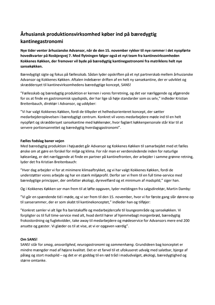 Nye tider venter århusianske Advansor, når de den 15. november rykker til nye rammer i det nyopførte hovedkvarter på Rosbjergvej 7. Med flytningen følger også et nyt team fra kantinevirksomheden Kokkenes Køkken, der fremover vil byde på bæredygtig kantinegastronomi fra matriklens helt nye sansekøkken.