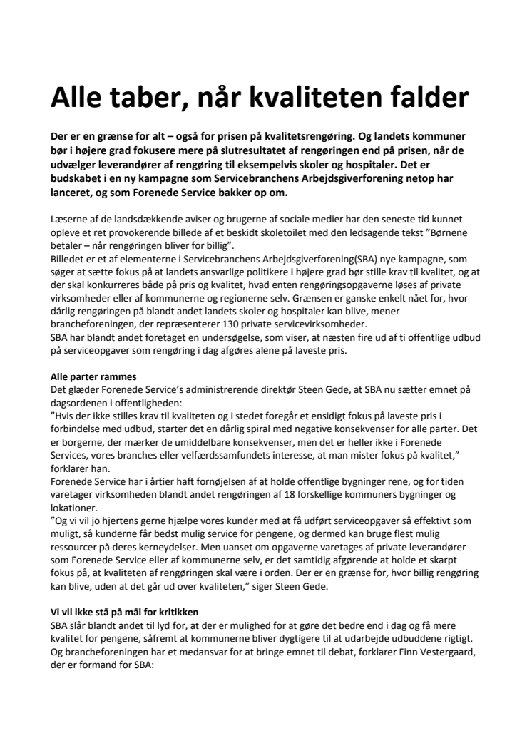 Der er en grænse for alt – også for prisen på kvalitetsrengøring. Og landets kommuner bør i højere grad fokusere mere på slutresultatet af rengøringen end på prisen, når de vælger leverandører af rengøring til eksempelvis skoler og hospitaler. Det er budskabet i en ny kampagne som Servicebranchens Arbejdsgiverforening netop har lanceret, og som Forenede Service bakker op om.