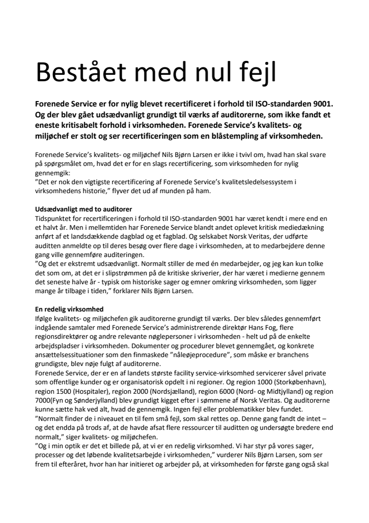 Forenede Service er for nylig blevet recertificeret i forhold til ISO-standarden 9001. Og der blev gået udsædvanligt grundigt til værks af auditorerne, som ikke fandt et eneste kritisabelt forhold i virksomheden. Forenede Service’s kvalitets- og miljøchef er stolt og ser recertificeringen som en blåstempling af virksomheden.