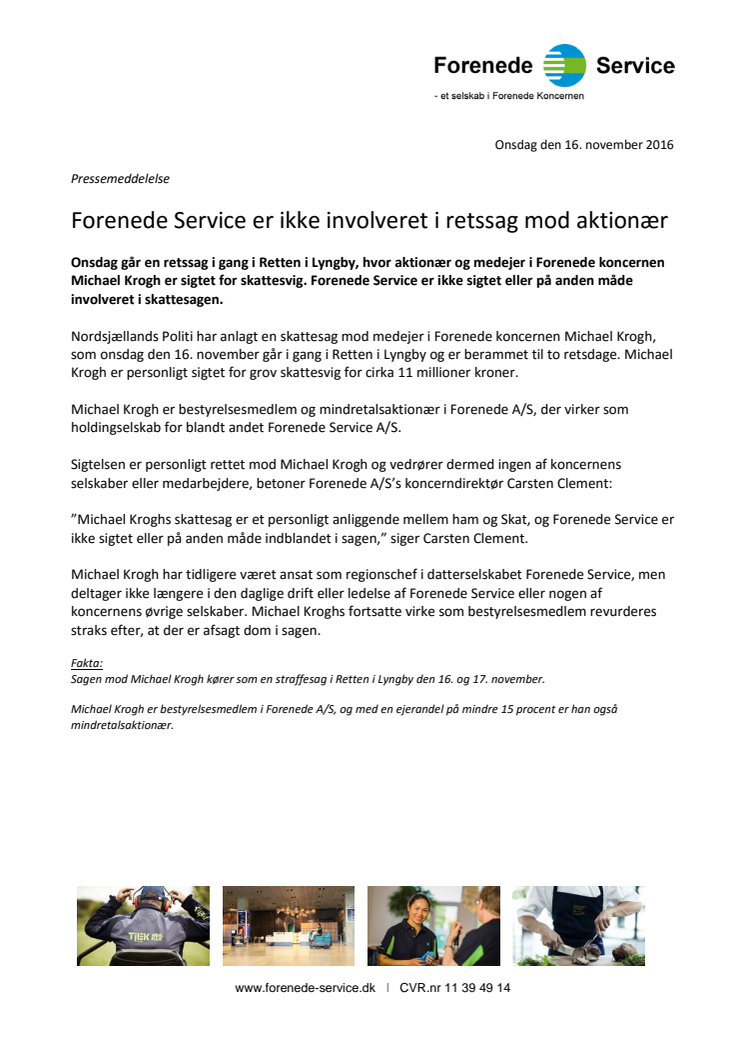 Onsdag går en retssag i gang i Retten i Lyngby, hvor aktionær og medejer i Forenede koncernen Michael Krogh er sigtet for skattesvig. Forenede Service er ikke sigtet eller involveret i sagen.
