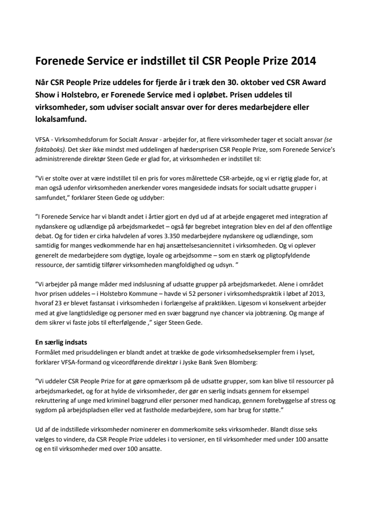 Når CSR People Prize uddeles for fjerde år i træk den 30. oktober ved CSR Award Show i Holstebro, er Forenede Service med i opløbet. Prisen uddeles til virksomheder, som udviser socialt ansvar over for deres medarbejdere eller lokalsamfund