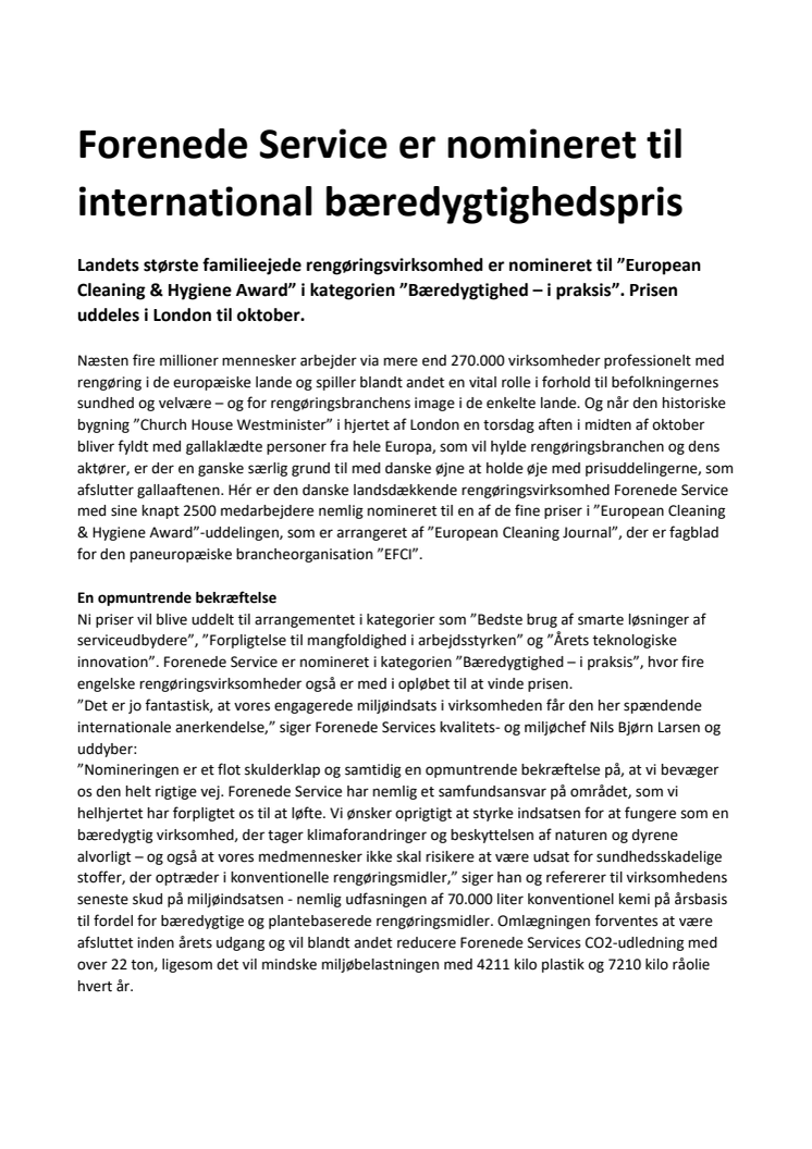 Landets største familieejede rengøringsvirksomhed er nomineret til ”European Cleaning & Hygiene Award” i kategorien ”Bæredygtighed – i praksis”. Prisen uddeles i London til oktober.