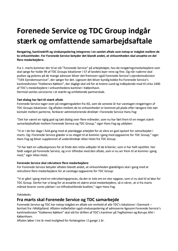 Forenede Service og TDC Group indgår stærk og omfattende samarbejdsaftale