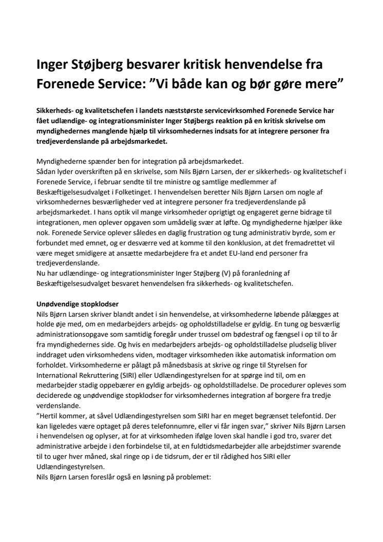 Sikkerheds- og kvalitetschefen i landets næststørste servicevirksomhed Forenede Service har fået udlændinge- og integrationsminister Inger Støjbergs reaktion på en kritisk skrivelse om myndighedernes manglende hjælp til virksomhedernes indsats for at integrere personer fra tredjeverdenslande på arbejdsmarkedet.