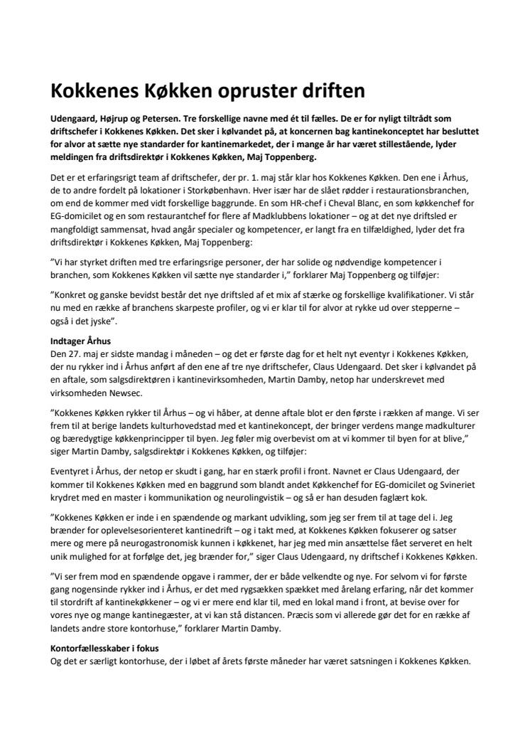 Udengaard, Højrup og Petersen. Tre forskellige navne med ét til fælles. De er for nyligt tiltrådt som driftschefer i Kokkenes Køkken. Det sker i kølvandet på, at koncernen bag kantinekonceptet har besluttet for alvor at sætte nye standarder for kantinemarkedet, der i mange år har været stillestående, lyder meldingen fra direktør i Kokkenes Køkken, Maj Toppenberg.