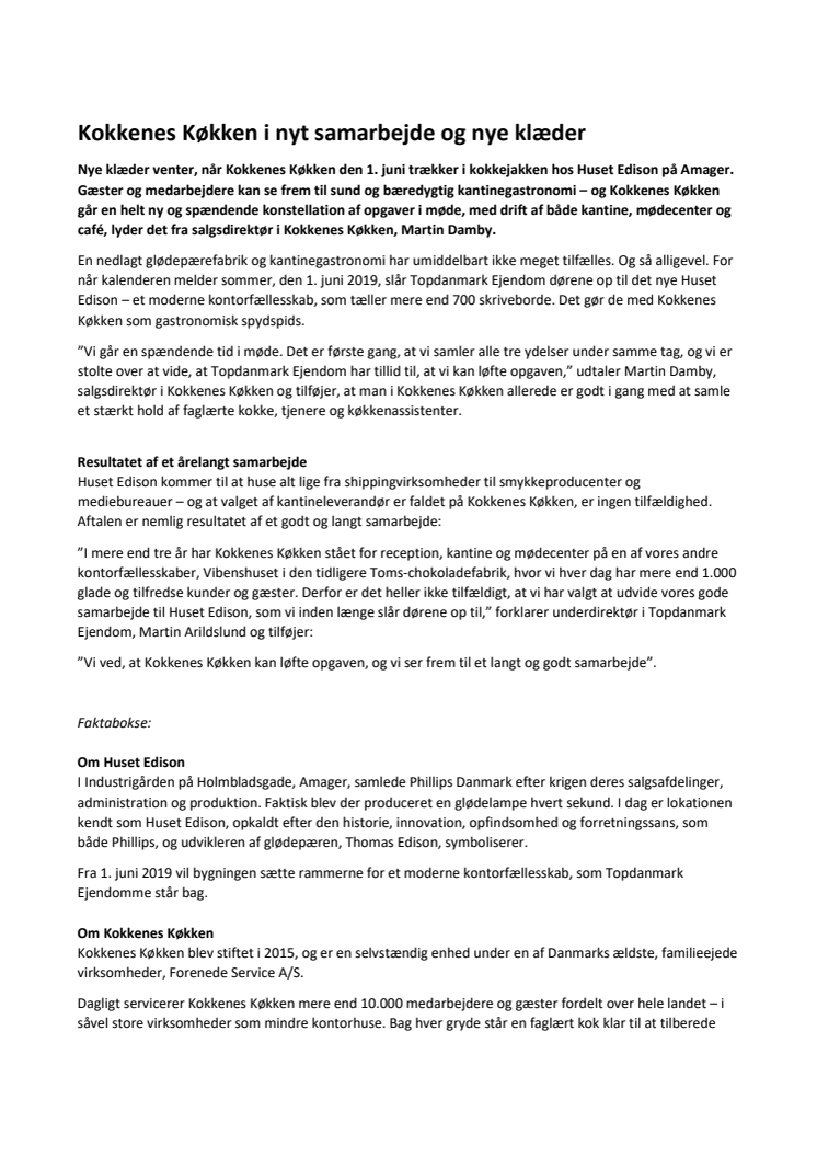 Nye klæder venter, når Kokkenes Køkken den 1. juni trækker i kokkejakken hos Huset Edison på Amager. Gæster og medarbejdere kan se frem til sund og bæredygtig kantinegastronomi – og Kokkenes Køkken går en helt ny og spændende konstellation af opgaver i møde, med drift af både kantine, mødecenter og café.