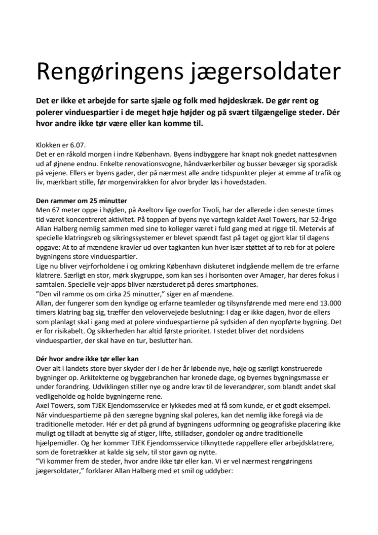 Det er ikke et arbejde for sarte sjæle og folk med højdeskræk. De gør rent og polerer vinduespartier i de meget høje højder og på svært tilgængelige steder. Dér hvor andre ikke tør være eller kan komme til.